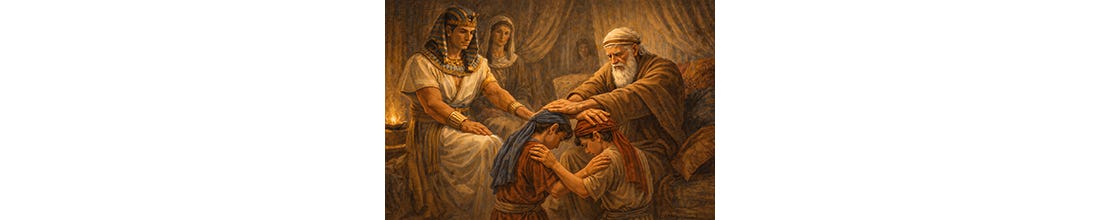 As Jacob nears the end of his life, he calls in Joseph’s boys, Ephraim and Manasseh, to bless them before he dies. Joseph brings his sons before his father, placing Manasseh, the older, on Jacob’s right and the younger, Ephraim, on Jacob’s left. Joseph’s intention was for the oldest to receive the greater blessing as was the custom. However, Jacob crosses his hands and gives the greater blessing to the younger Ephraim. This keeps the pattern that we’ve seen play out several times already, including with Jacob himself…the younger usurps the older in blessing and honor. More examples: